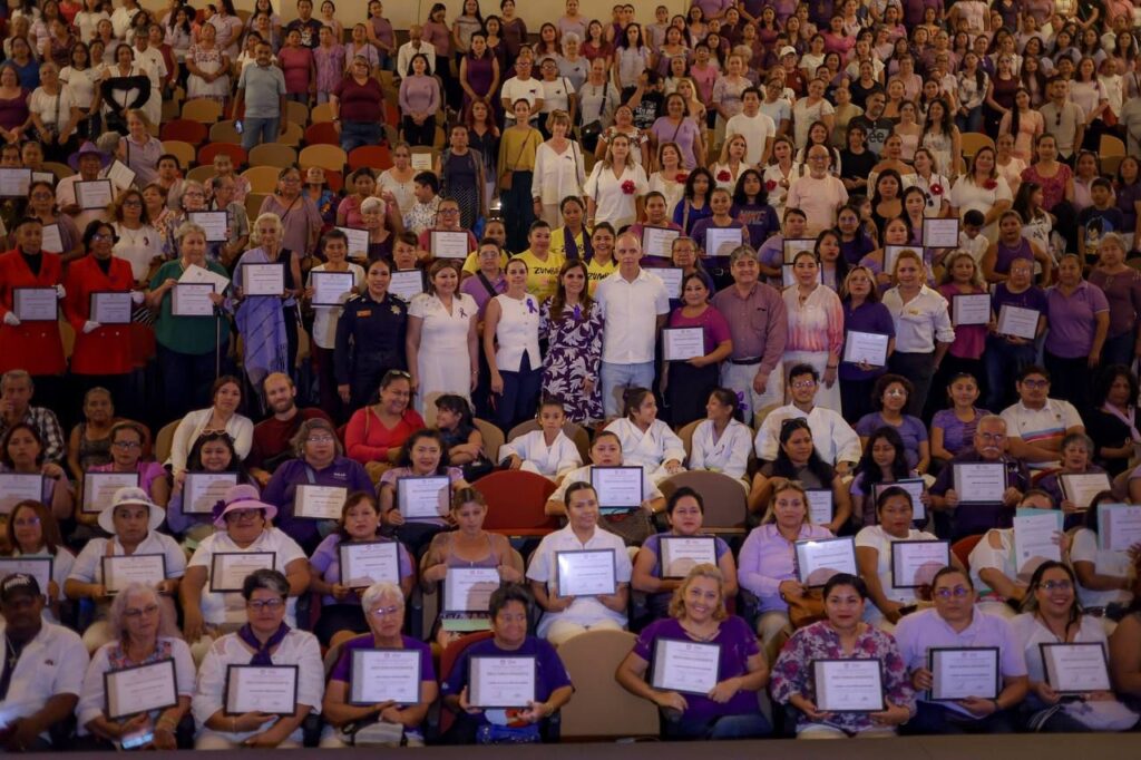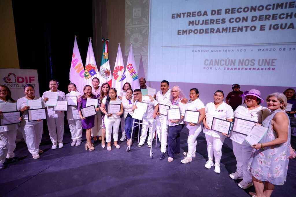 En conmemoración al Día Internacional de la Mujer, la Presidenta Municipal, Ana Paty Peralta y la presidenta honoraria del Sistema para el Desarrollo integral de la Familia (DIF) Quintana Roo, Verónica Lezama Espinosa, en representación de la gobernadora, Mara Lezama, hicieron entrega de 250 distinciones a maestras, alumnas y personas adultas mayores que participaron en diferentes talleres que realiza el DIF Benito Juárez, en coordinación con los Centros de Capacitación para el Trabajo Industrial (CECATI) 149.