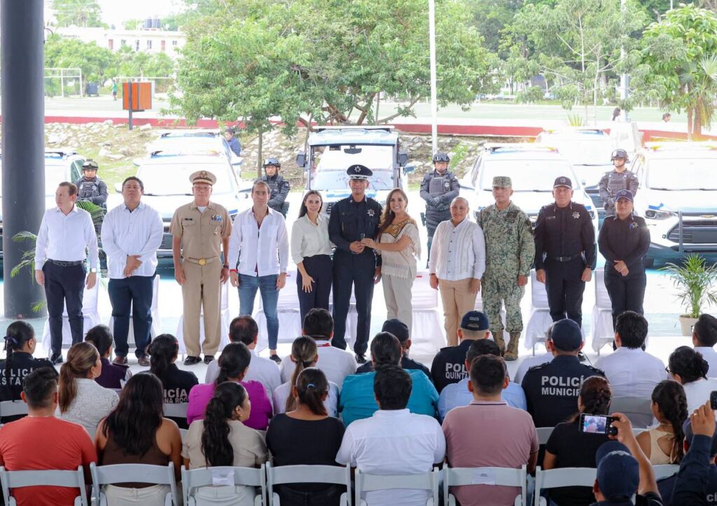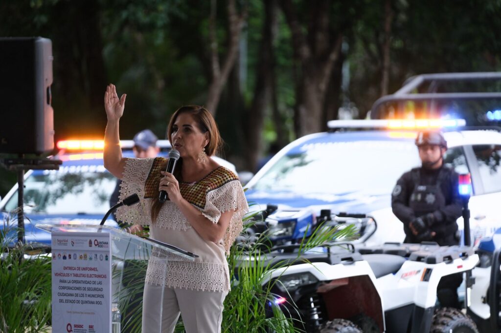 TULUM.- Para fortalecer a las instituciones de seguridad ciudadana de los 11 municipios del estado de Quintana Roo y avanzar más rápido en la construcción de paz, la gobernadora Mara Lezama Espinosa entregó uniformes, vehículos y tabletas electrónicas para las policía municipales, con un valor superior a los 48 millones de pesos.