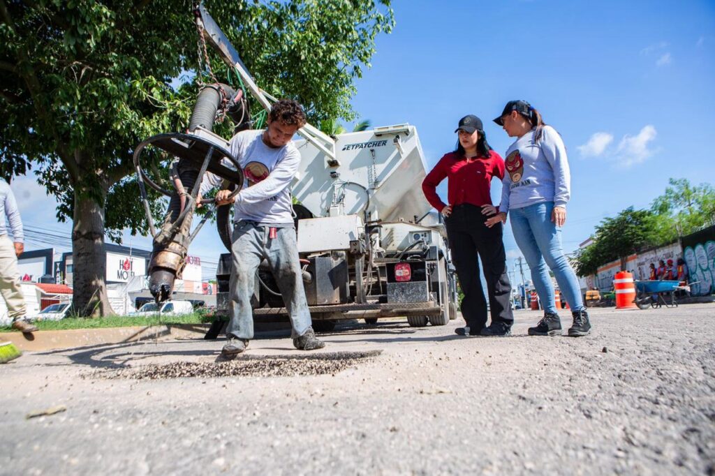 La presidenta municipal de Solidaridad, Estefanía Mercado, supervisó hoy los trabajos de bacheo que se llevan a cabo en diversos puntos de la ciudad, como parte del operativo emergente para atender el rezago acumulado de tres años y que se acentuó con las fuertes lluvias de los meses recientes.