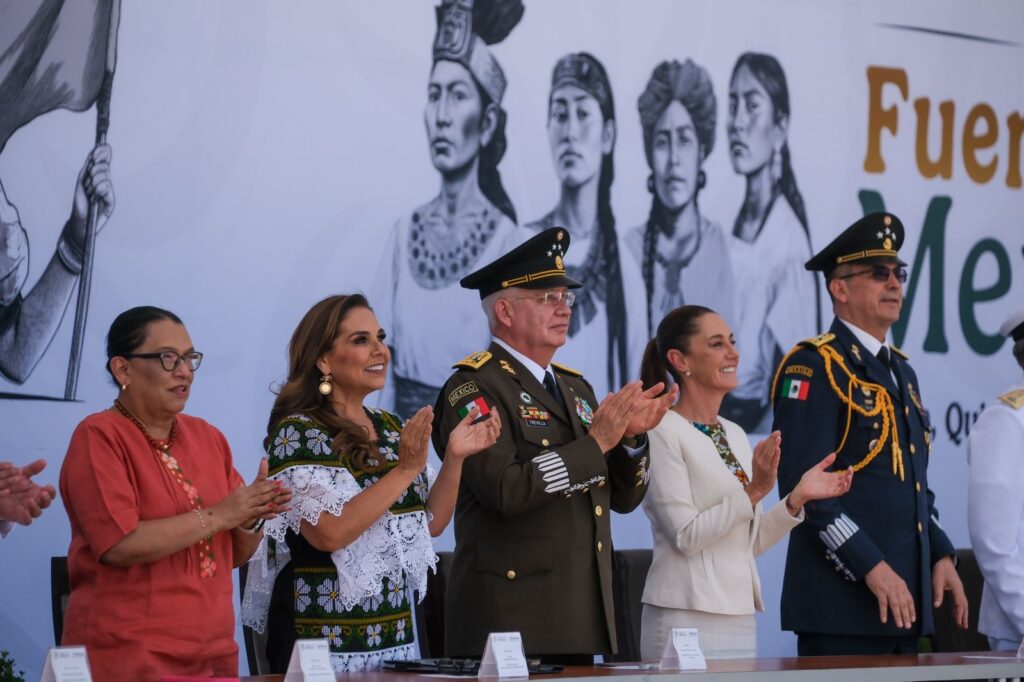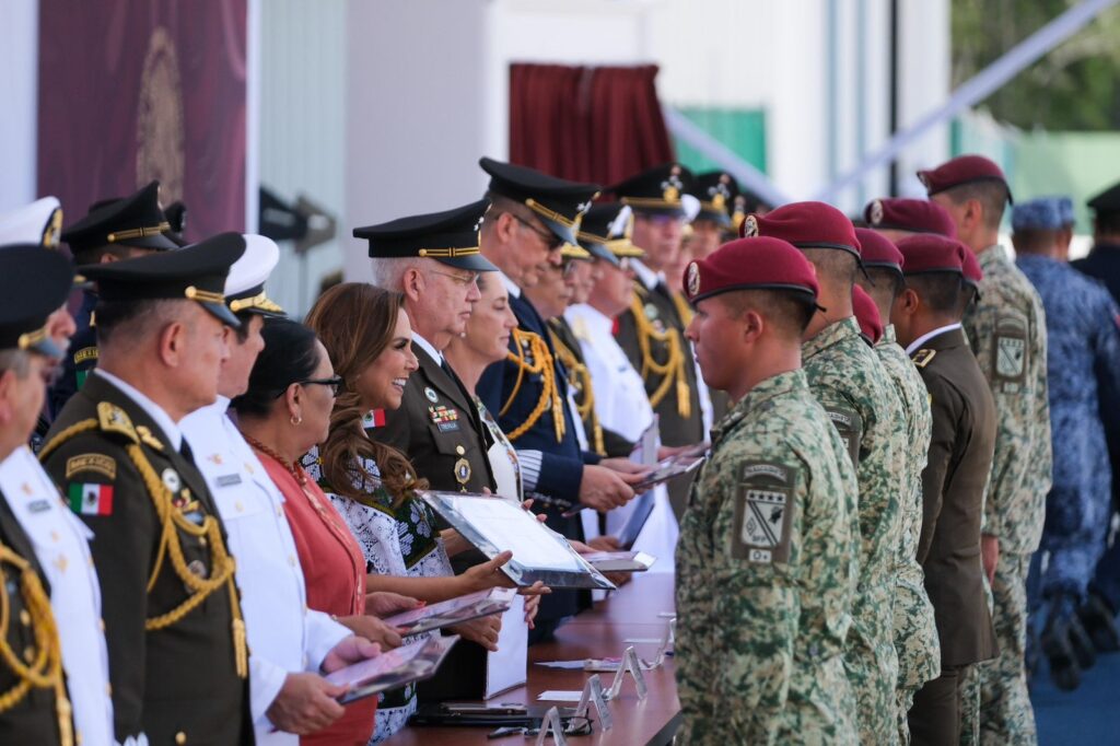 La gobernadora Mara Lezama estuvo en el presidium, junto al Secretario de la Defensa Nacional, Ricardo Trevilla Trejo; el Secretario de la Marina, Raymundo Pedro Morales Ángeles; el Comandante de la Fuerza Aérea Mexicana, Oscar René Rubio Sánchez, así como de más invitados.